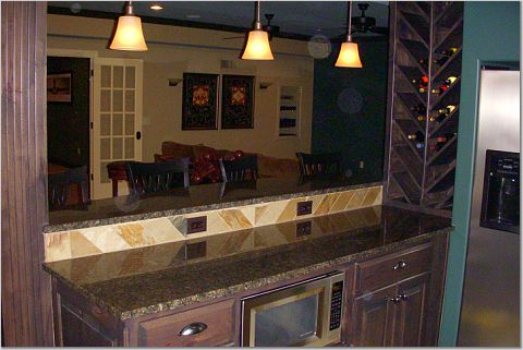 Inside of bar shows granite countertops and custom wine rack.