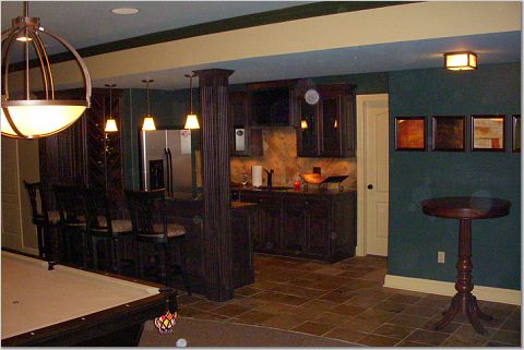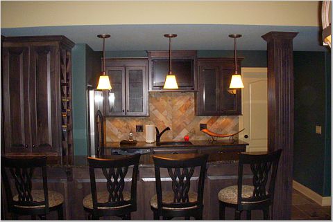 Custom dyed alder bar cabinets and slate floor.