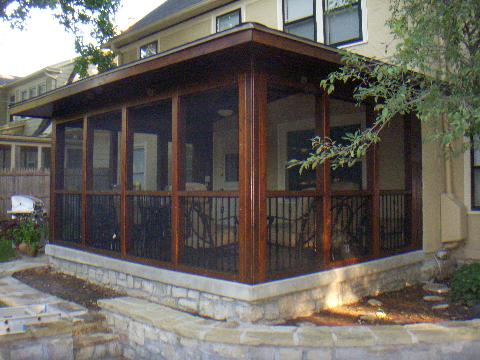 Screened in cedar porch with wrought iron spindle railing
